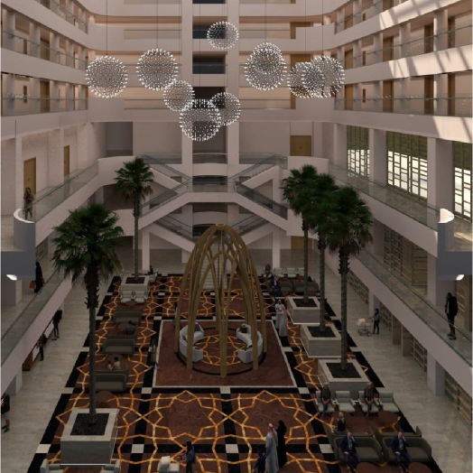 The hotel suites are designed for long-term stays for families or individuals with companions. The entrance to the Hotel Suites is located on the ground floor, situated on the east side of the building. A stunning five-story lobby welcomes guests, providing ample natural daylight. Key features of the hotel suites include: